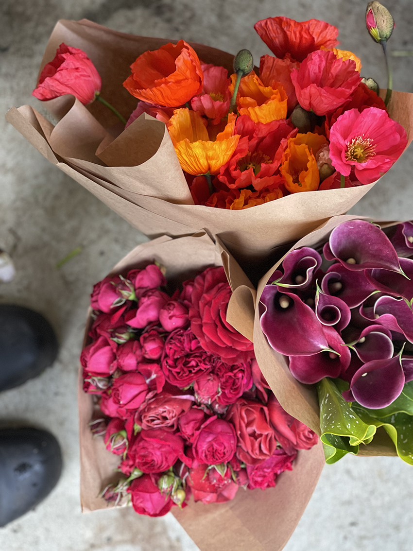 Some of late spring/early summer’s favourite flowers are poppies, sweet peas, anemones, peonies, species gladioli, callas, scabiosa pincushions, cornflowers, long lasting chincherinchee, garden roses, lavatera, billy’s buttons, proteas, leucospermum pincushions and so many more…