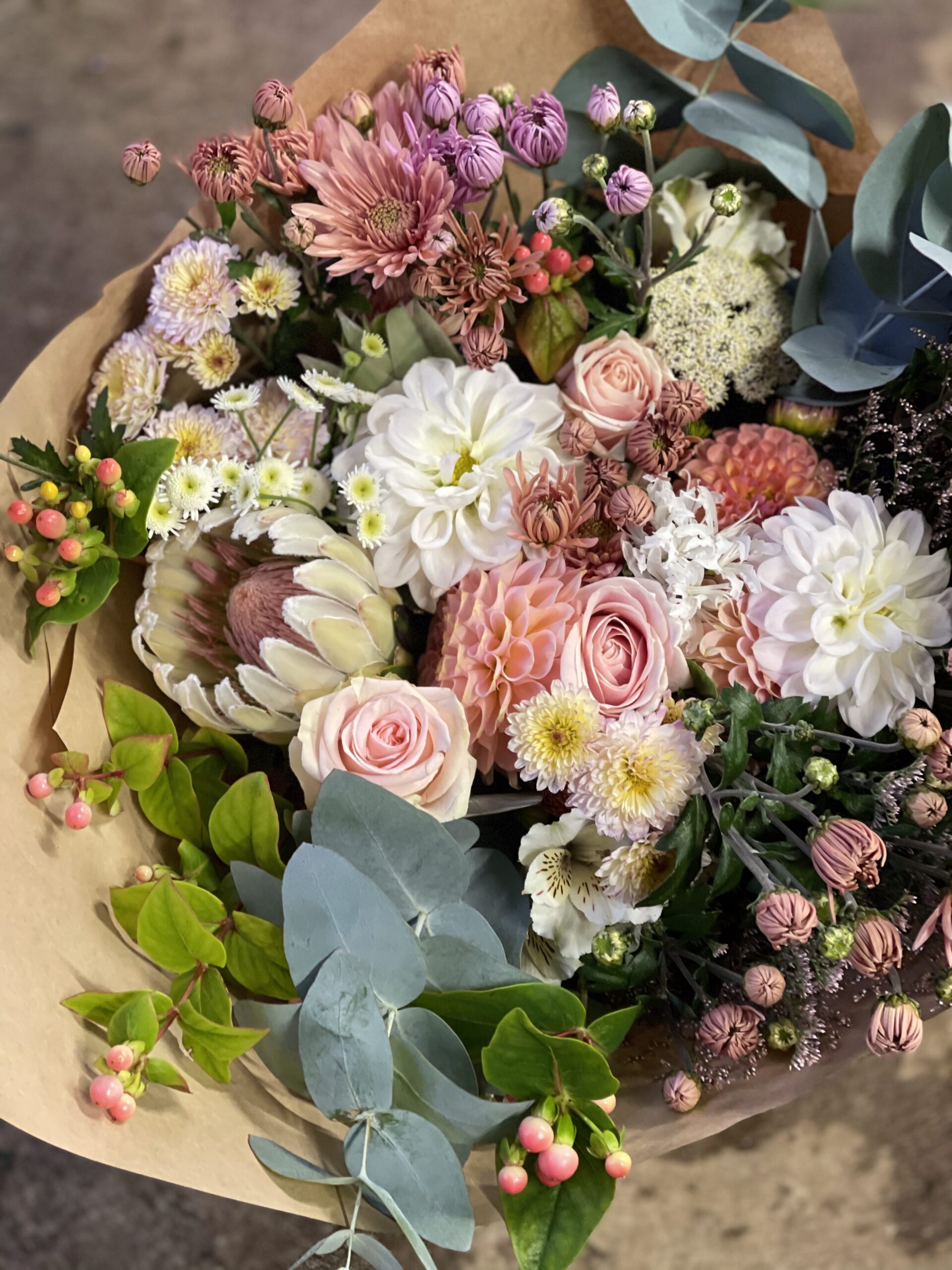 - Our large seasonal signature autumn arrangement. $85 Wrapped in brown kraft paper, delivered in water (pic 11, 12, 13 and 14)