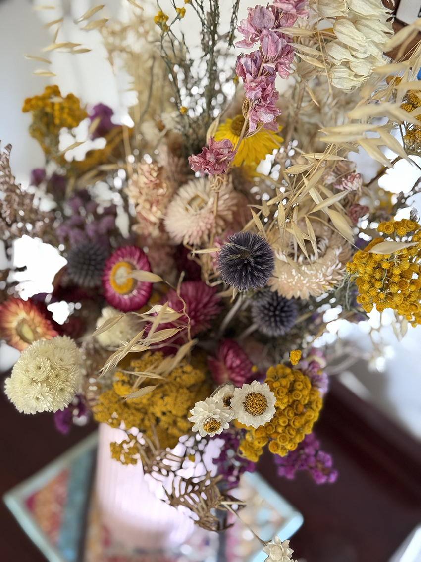 - 3 x dried mini posies – in white ceramic vases in reclaimed timber tray. $62.50 All naturally air dried, a pretty selection from our farm to last through the winter months! (no water) pic 20 + 21