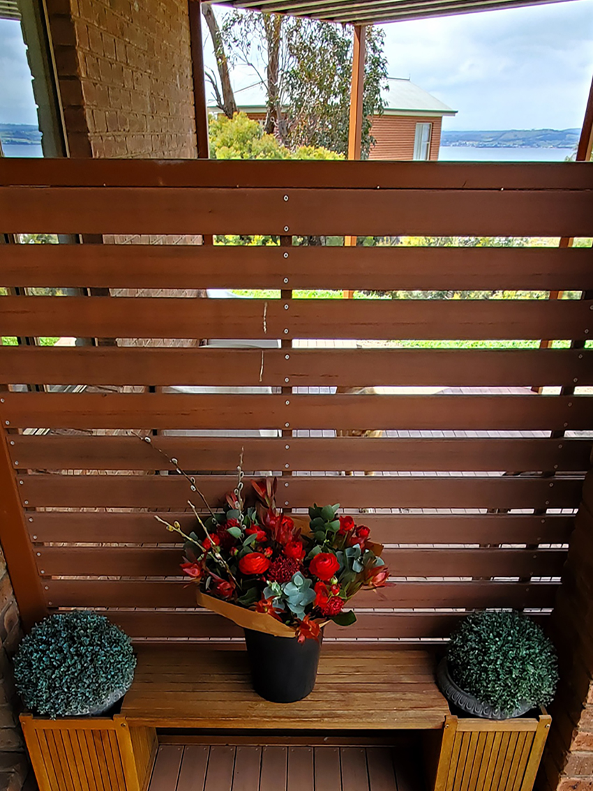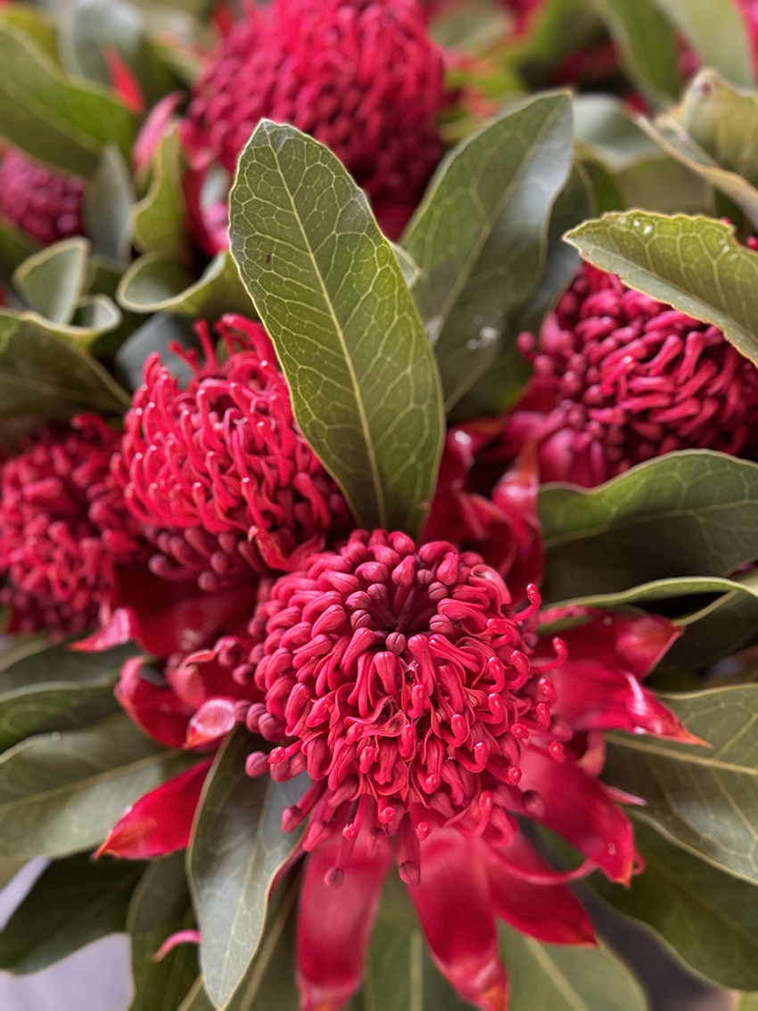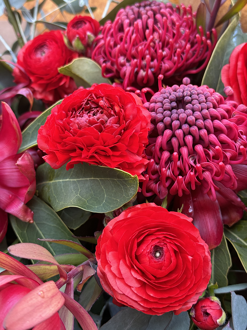 RED – Red Waratahs, lush red ranunculus, red leucodendrons, spinning gum and pussy willow